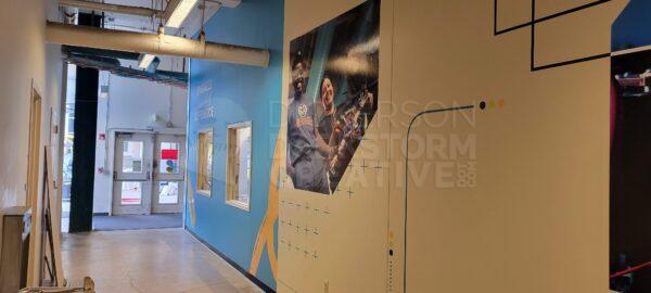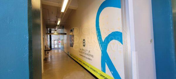 Below are photos from the final installation, with a view of each mural and how they interact with one another. In particular, the one point I was going for was that if you were standing at mural 1 on the north end, the college’s tagline “Engineer a World of Difference” was above you and in the distance. Moving down the hallway, that tagline would always be visible, connecting the entire mural stretch and tour path together.