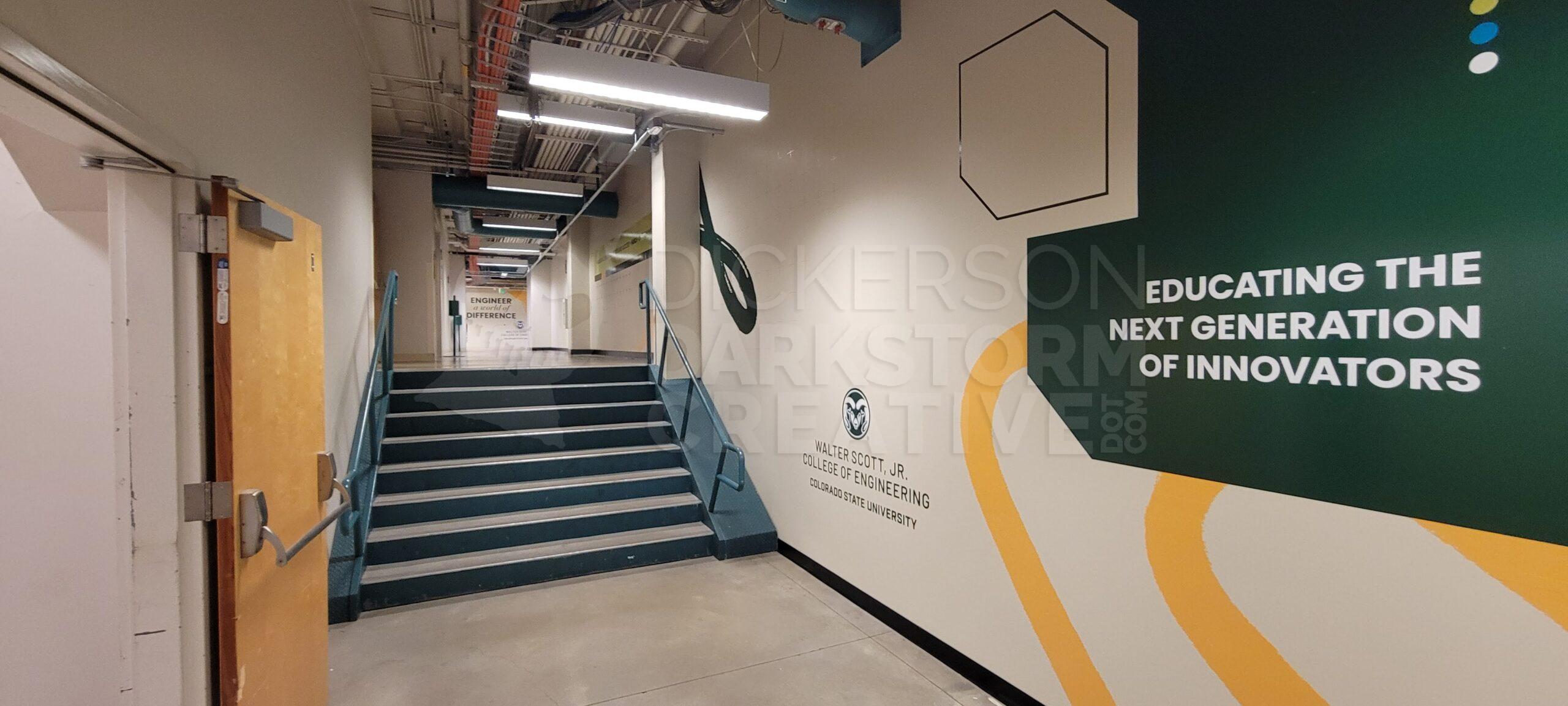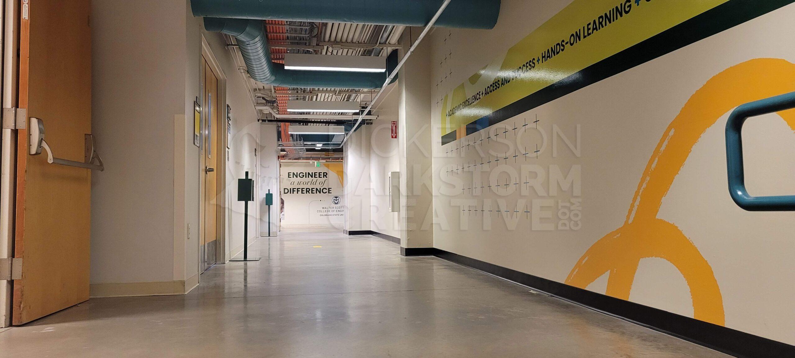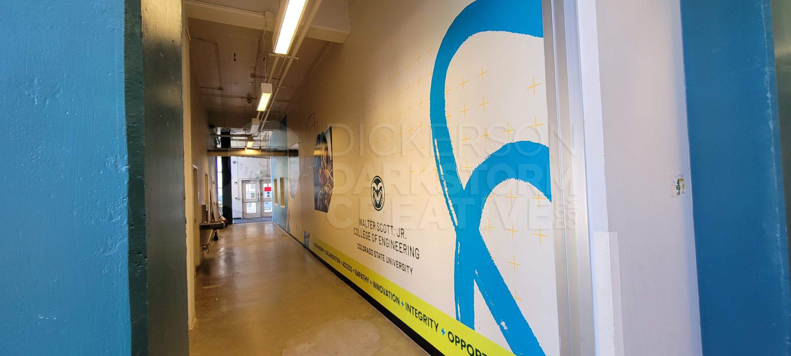 I designed four very large murals for the walls of the first floor in the CSU Engineering Building. Working with a local vendor for printing/application and university facilities for general cleanup and painting, the overall process took several weeks.