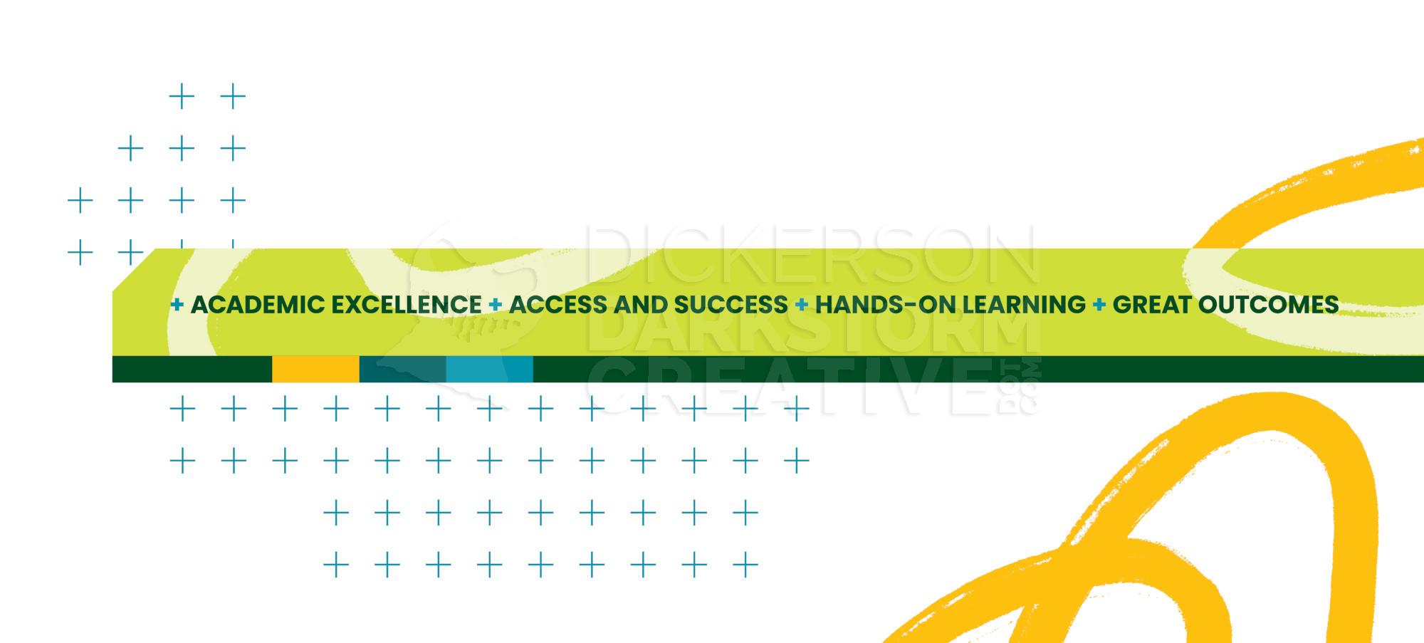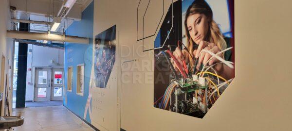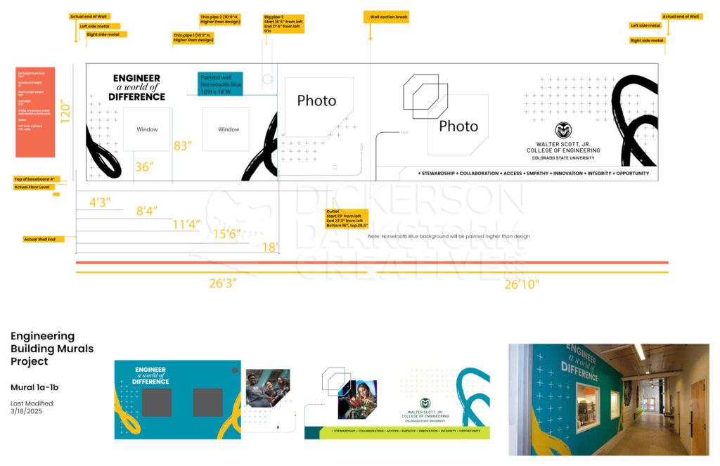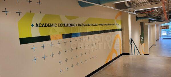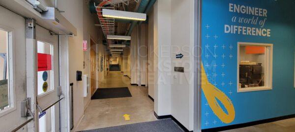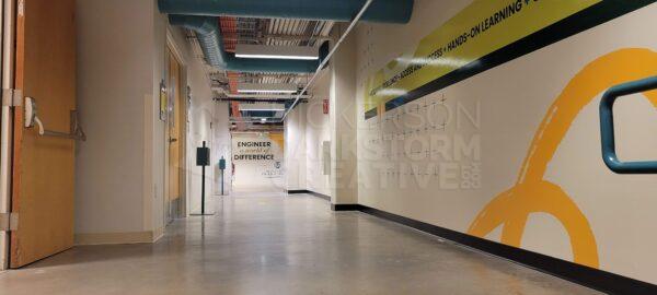 Below are photos from the final installation, with a view of each mural and how they interact with one another. In particular, the one point I was going for was that if you were standing at mural 1 on the north end, the college’s tagline “Engineer a World of Difference” was above you and in the distance. Moving down the hallway, that tagline would always be visible, connecting the entire mural stretch and tour path together.